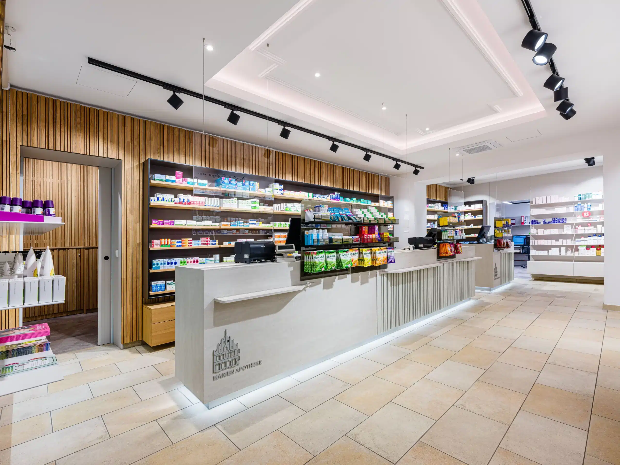 In partnerschaftlicher Zusammenarbeit mit der Apothekerfamilie Haustein entstand ein Raum, der Vertrauen schenkt, zum Verweilen einlädt und die Werte der Marien Apotheke erlebbar macht: Nähe, Fürsorge und Verbundenheit.